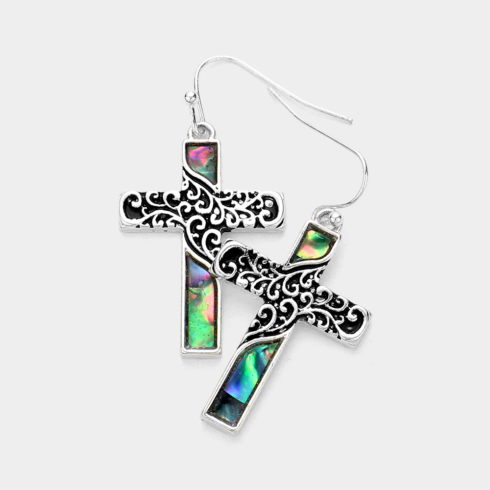 Abalone Embossed Antique Metal Cross Dangle Earrings