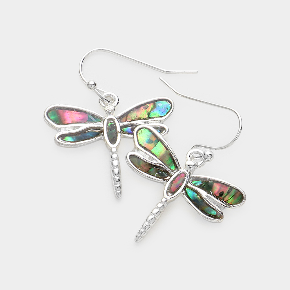 Abalone Embossed Metal Dragonfly Dangle Earrings