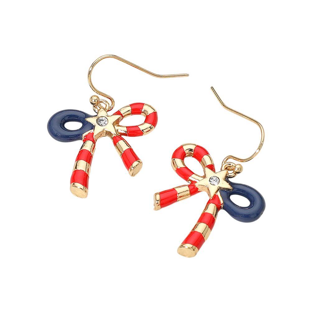 Details • Size : 0.8" X 1.25" • Fish Hook Back • Add festive charm with these patriotic candy cane bow drop earrings featuring a playful ribbon design and star accent. Lightweight and easy to style, they’re perfect for holidays, parades, themed events, and seasonal displays. A fun statement accessory ideal for boutique collections and giftable USA-inspired jewelry selections. • Lead and Nickel Compliant