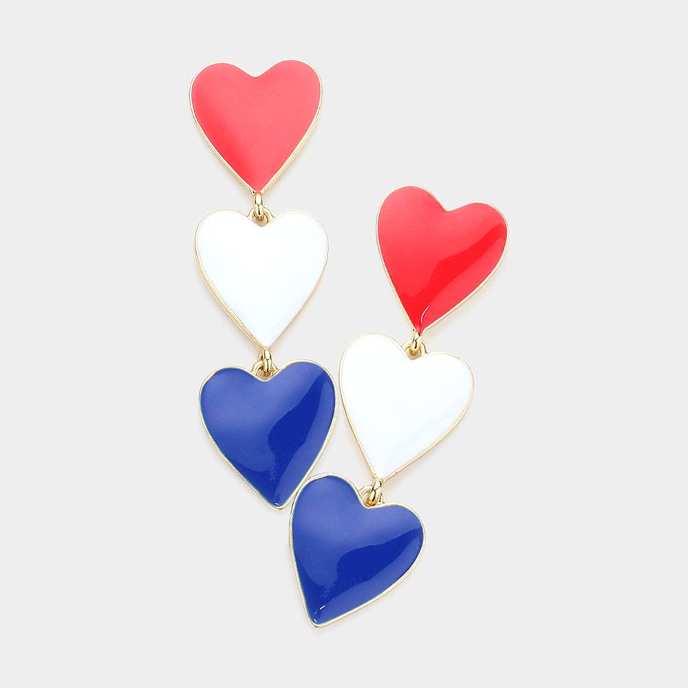 American USA Colored Triple Enamel Heart Link Dangle Earrings