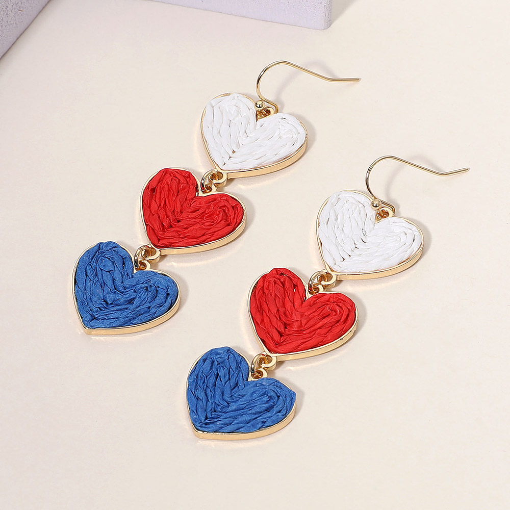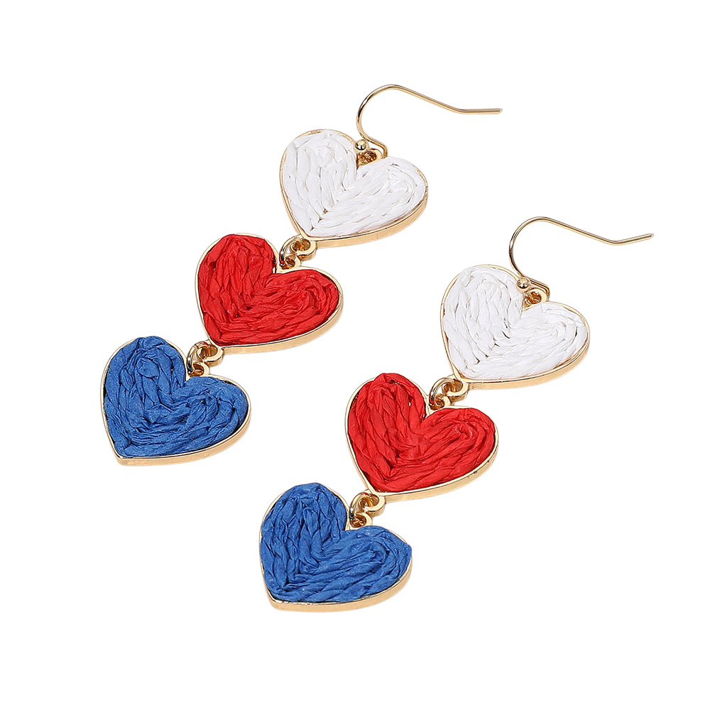 American USA Flag Triple Raffia Heart Link Dropdown Dangle Earrings