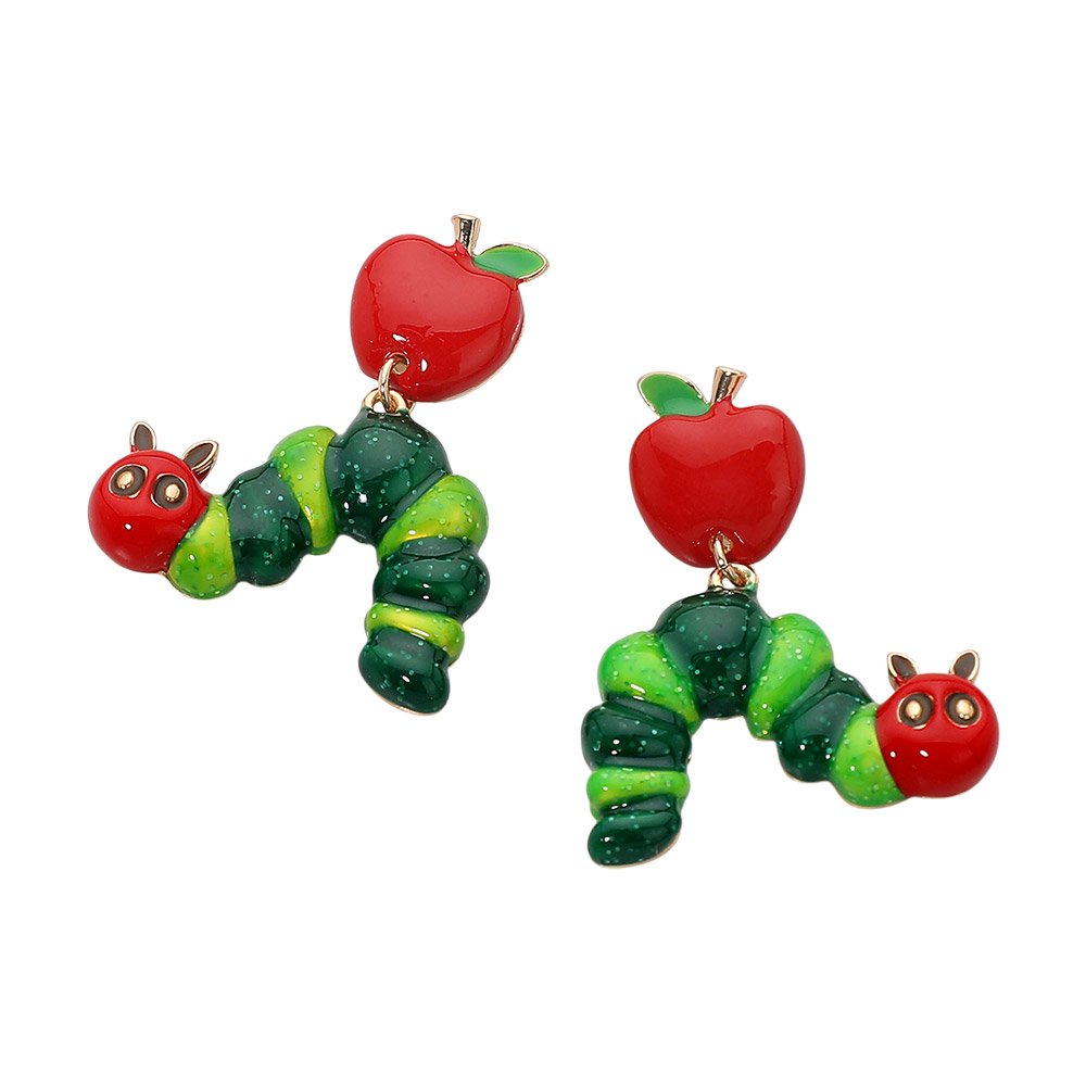 Details • Size : 1.25" X 1.6" • Post Back • Whimsical drop earrings featuring an apple accent paired with a playful caterpillar design. Created to stand out with fun movement and charm, these novelty earrings are ideal for themed collections, gifts, events, and eye-catching displays that bring a cheerful, storybook-inspired touch. • Lead and Nickel Compliant