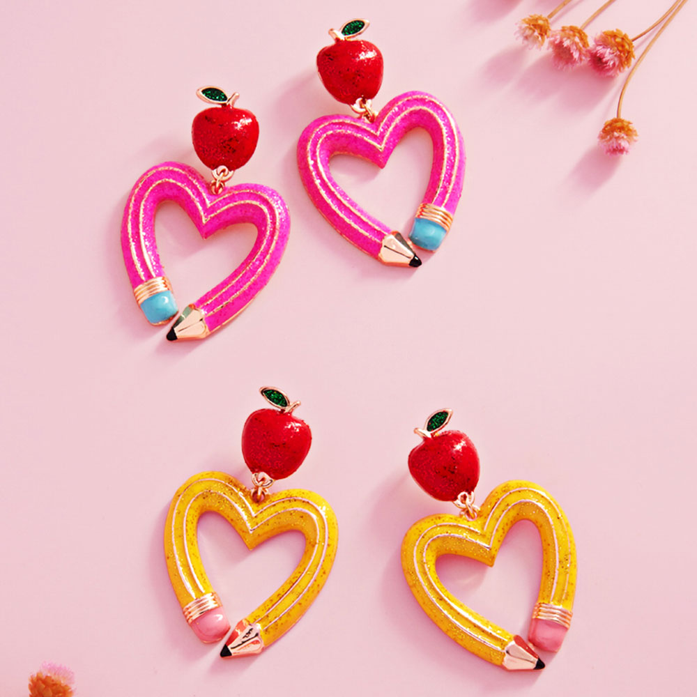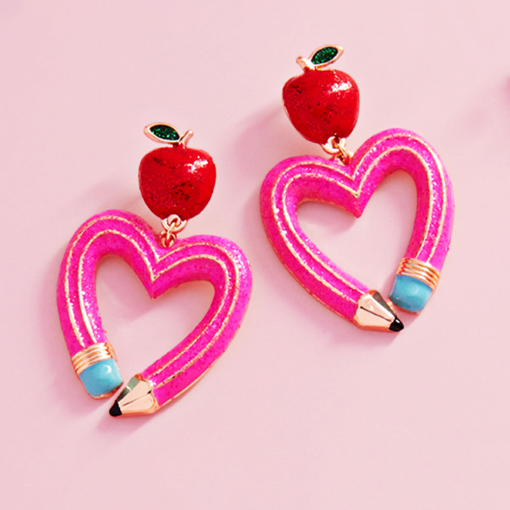 Details • Size : 1.2" X 1.75" • Titanium Post Back • Playful drop earrings featuring an apple charm paired with a heart-shaped pencil design for a school-inspired statement. Lightweight and fun, they elevate casual looks, themed outfits, classroom events, or gift ideas while remaining comfortable for all-day wear. • Lead and Nickel Compliant • Hypoallergenic