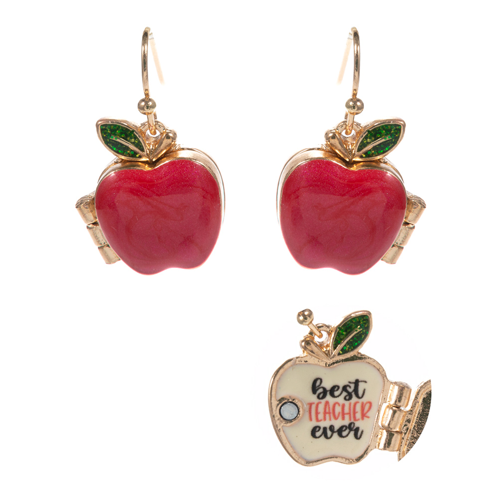 Details • Size : 0.7" X 1" • Brass Fish Hook Back • These apple locket drop earrings feature a charming fruit-inspired design that opens to reveal a meaningful teacher message inside. Designed with playful detail and gentle movement, they add personality and sentiment to everyday outfits. Perfect for teacher gifts, appreciation events, or themed collections, they offer a fun yet heartfelt accessory that stands out while remaining easy to wear. • Hypoallergenic • Lead and Nickel Compliant