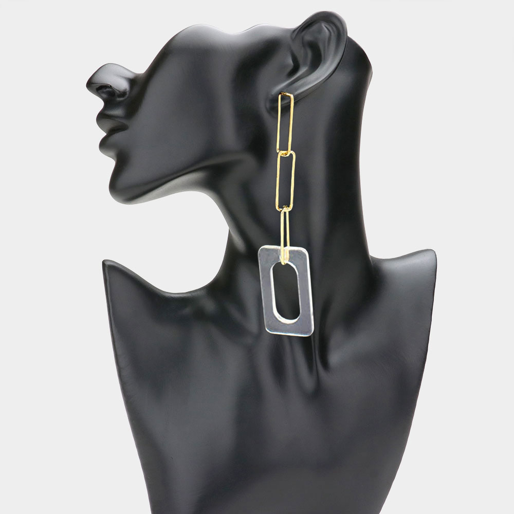 Details • Size : 0.9" X 4.4" • Post Back • Chic geometric drop earrings featuring a bold rectangular pendant suspended from a sleek chain design. These lightweight statement earrings add a touch of modern elegance, perfect for enhancing both casual and dressy outfits. • Lead and Nickel Compliant