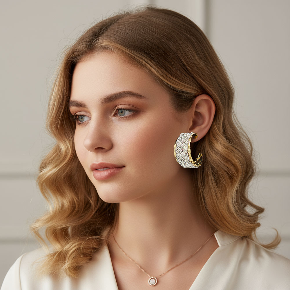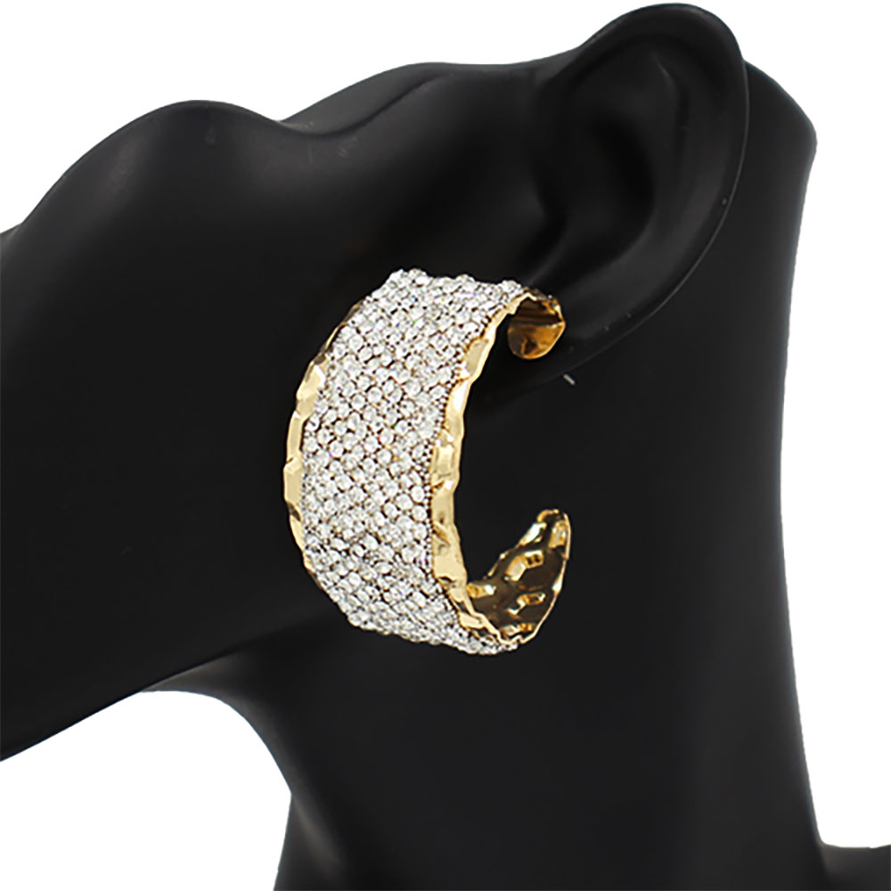 Details • Size : 1.75" X 1.75" X 1" • Post Back • Elevate your look with these Wide Hoop Earrings featuring a stunning rhinestone pave design that exudes luxury and brilliance. Perfect for evening events or special occasions, these bold statement earrings bring elegance and sparkle to any sophisticated outfit. • Lead and Nickel Compliant