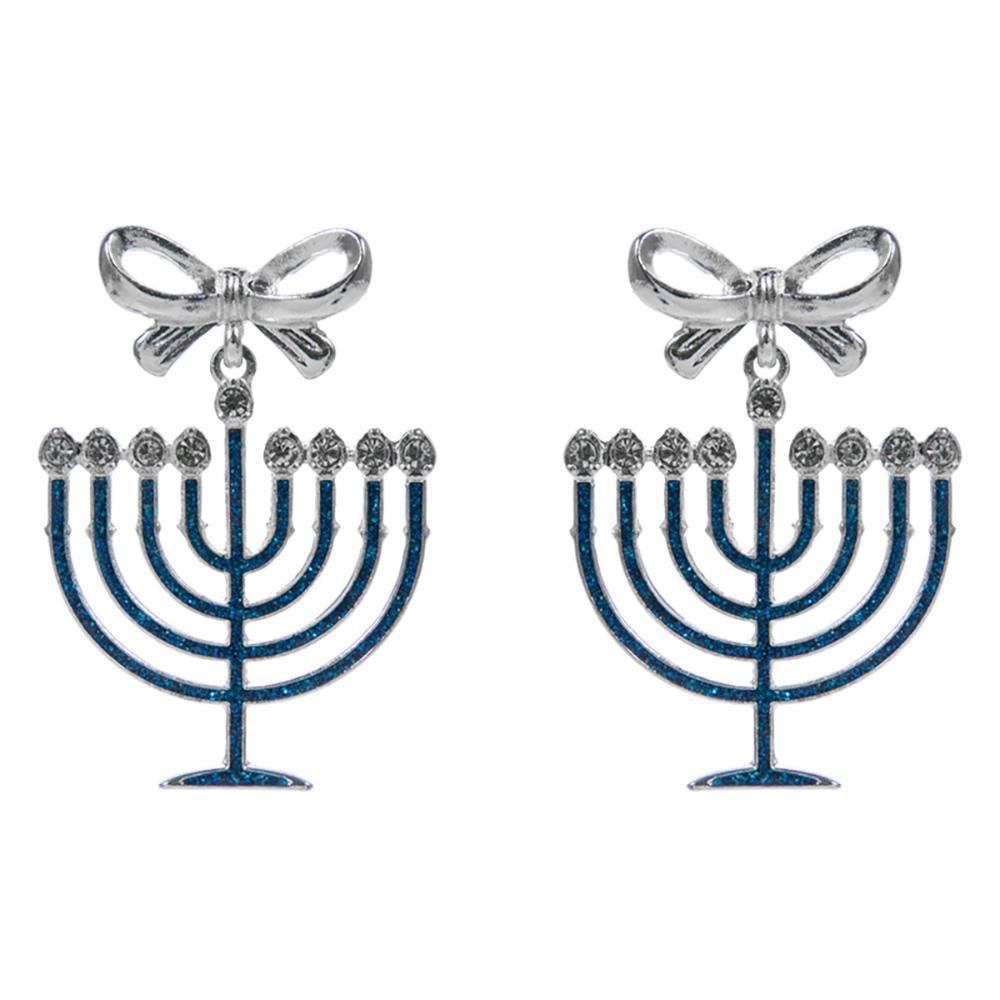 • Celebrate tradition with these menorah dangle earrings adorned with sparkling bow accents and detailed candle design. A meaningful accessory perfect for Hanukkah, holidays, or festive occasions, combining cultural symbolism with playful, elegant style.