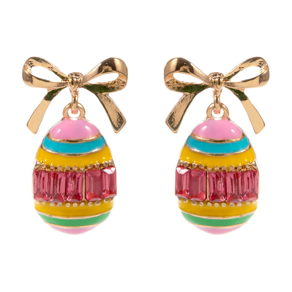 • Playful drop earrings featuring a decorative egg charm suspended from a delicate bow accent. Designed to stand out with layered detailing and a festive silhouette, these novelty earrings are ideal for spring assortments, Easter promotions, themed gifting, and eye-catching boutique jewelry displays.