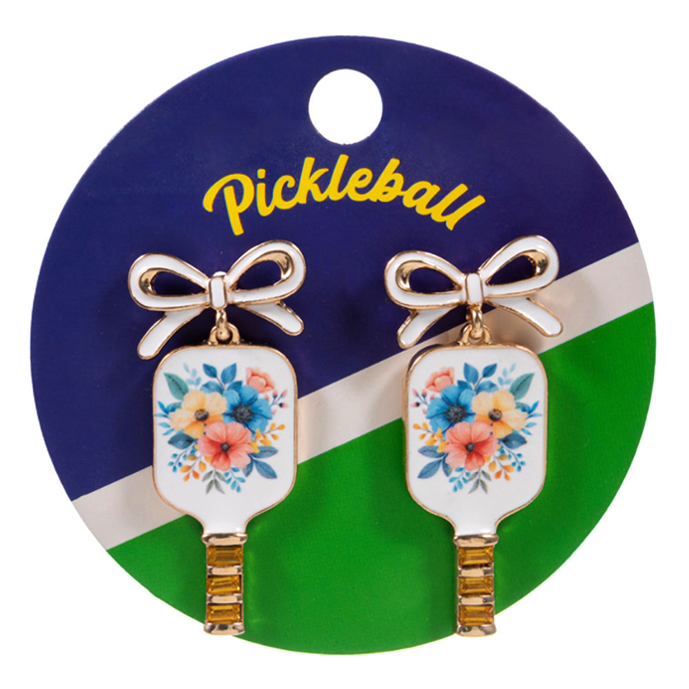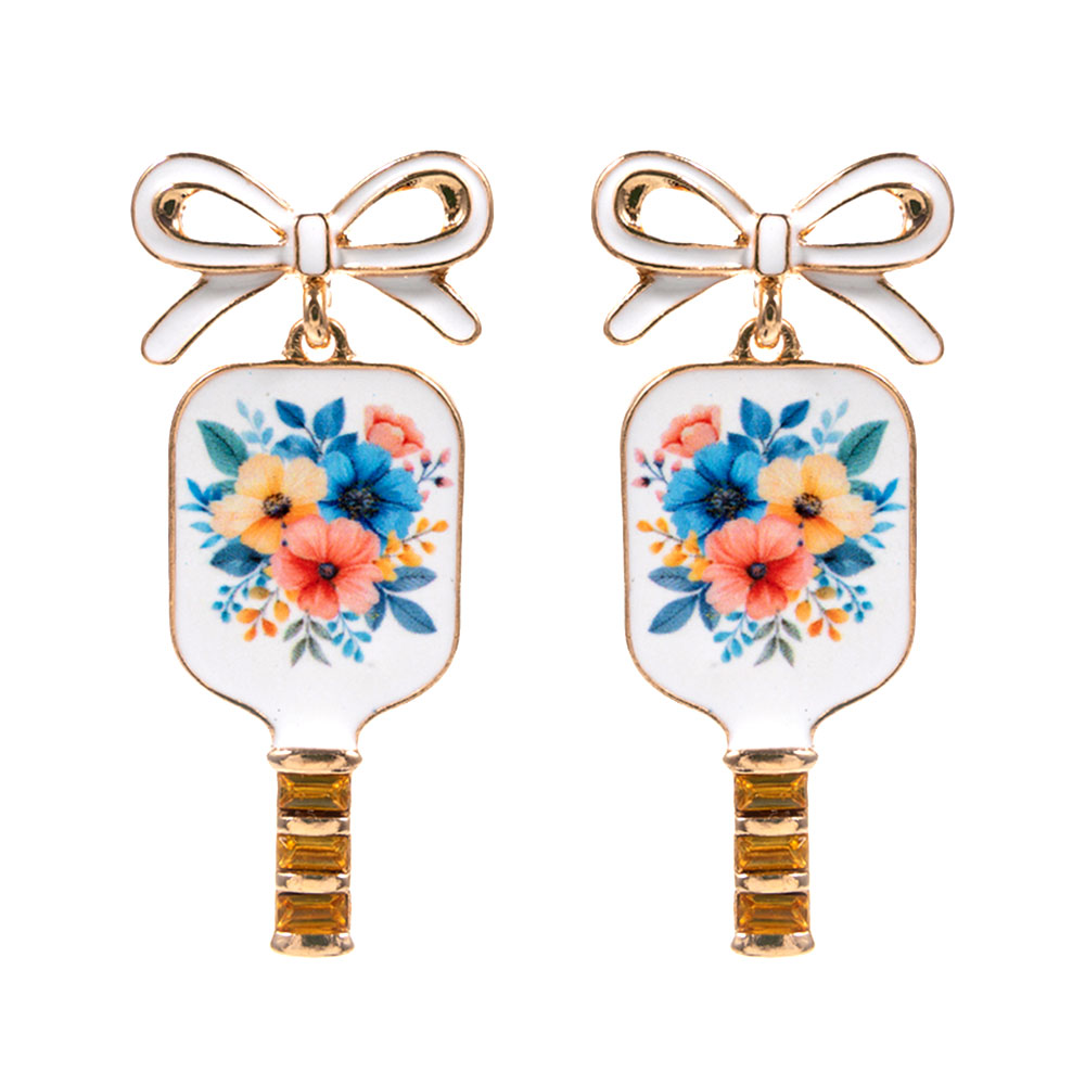 Details • Size : 0.8" X 1.75" • Post Back • These pickleball paddle drop earrings feature a charming bow accent and playful patterned design, adding a fun and sporty touch to any outfit. Perfect for everyday wear, gifting, or pickleball lovers, they bring personality and style to casual looks while remaining lightweight and easy to pair with seasonal accessories. • Lead and Nickel Compliant