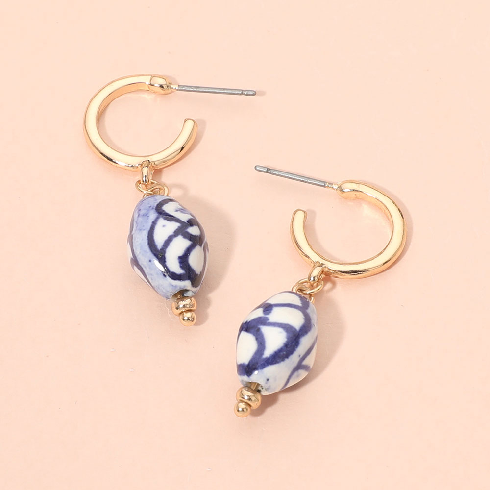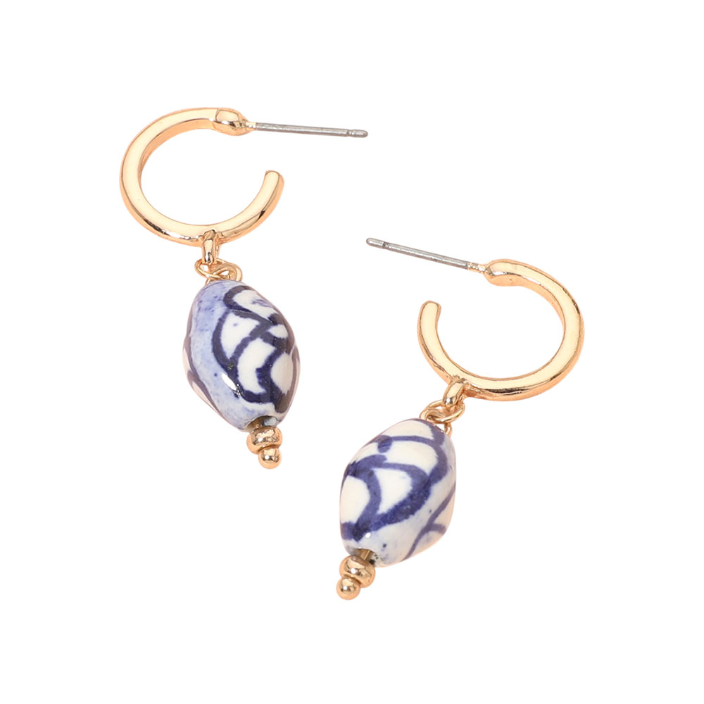 Details • Size : 0.75" X 1.5" • Post Back • Modern drop hoop earrings featuring a sculptural patterned bead that adds visual interest and gentle movement. Designed to elevate everyday styling while remaining easy to pair with layered looks, these earrings offer a distinctive silhouette ideal for boutiques, gifting, and trend driven accessory assortments. • Lead and Nickel Compliant