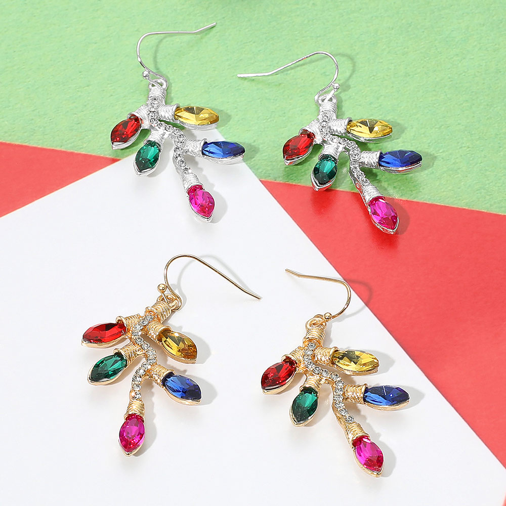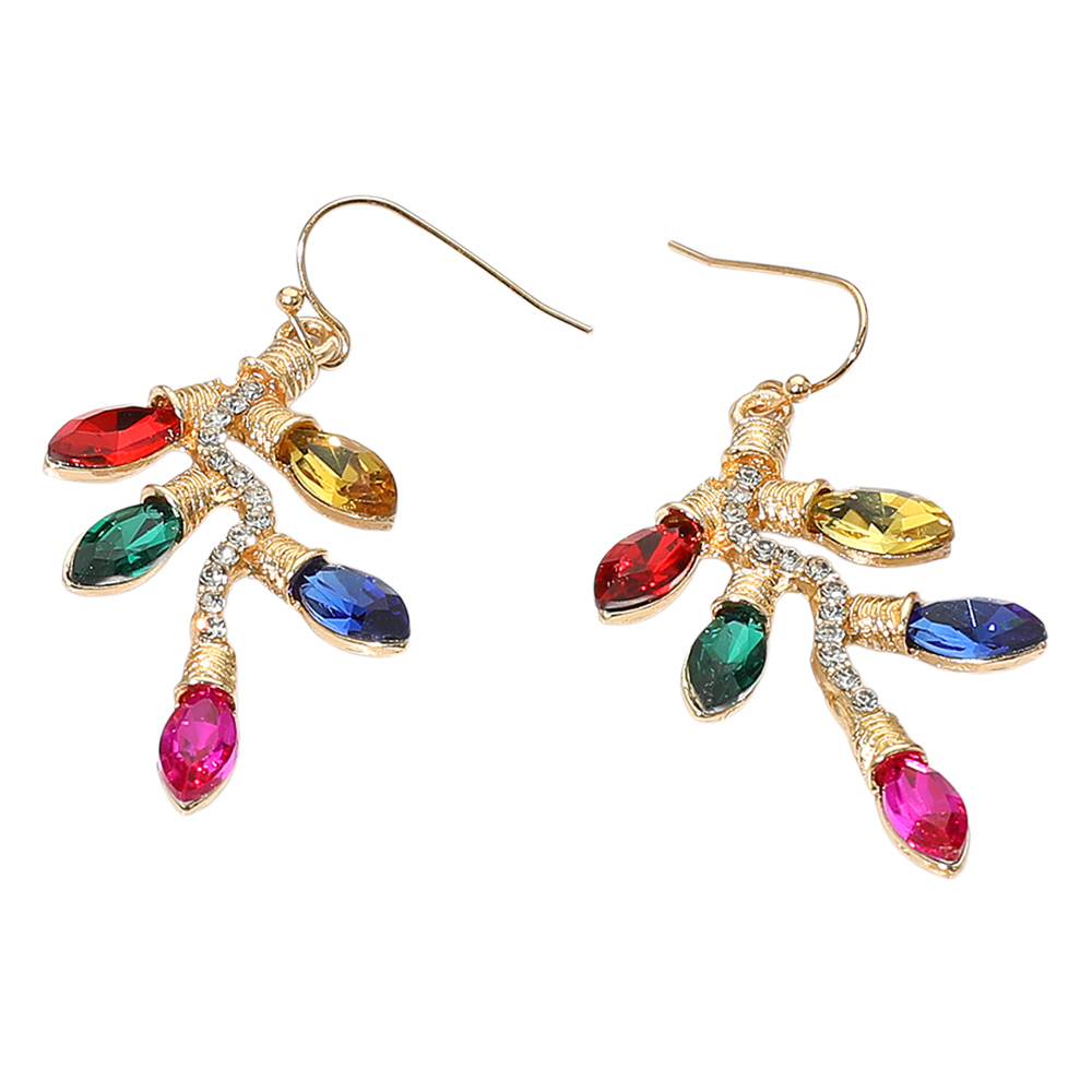 Details • Size : 1.1" X 2" • Fish Hook Back • Light up your holiday style with these Colorful Christmas Light Earrings, designed to resemble sparkling string lights in a festive array of colors. Featuring vibrant multi colored teardrop crystals set on a gold-tone branch-like frame with rhinestone accents, these earrings bring instant cheer and glamour to any holiday outfit. Lightweight and fun, they're perfect for Christmas parties, stocking stuffers, or adding playful charm to winter looks. • Lead and Nickel Compliant