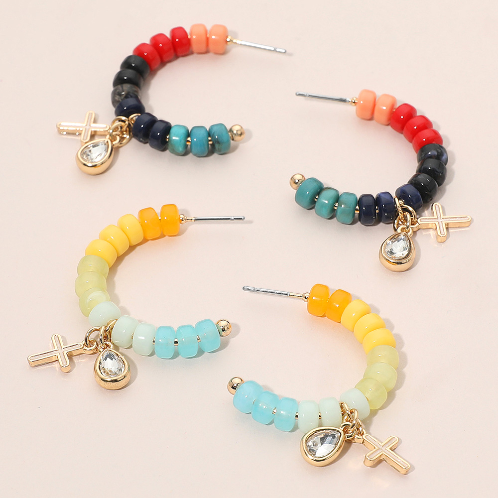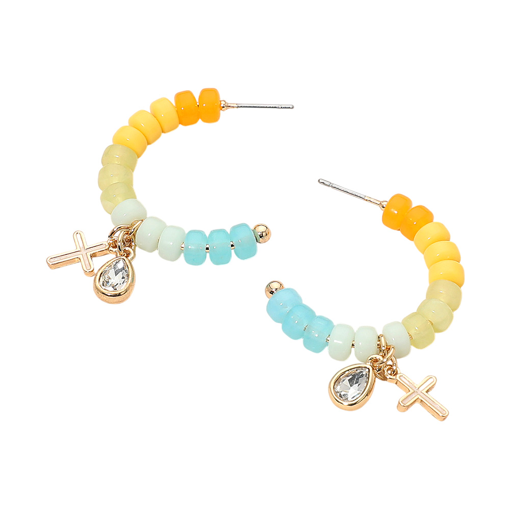 Details • Size : 1.25" X 1.6" • Post Back • Stylish beaded hoop earrings accented with cross and crystal charms for a trendy, boho-inspired look. Lightweight and unique, these hoops add personality to any outfit, making them perfect for festivals, casual days, or statement accessory lovers. • Lead and Nickel Compliant
