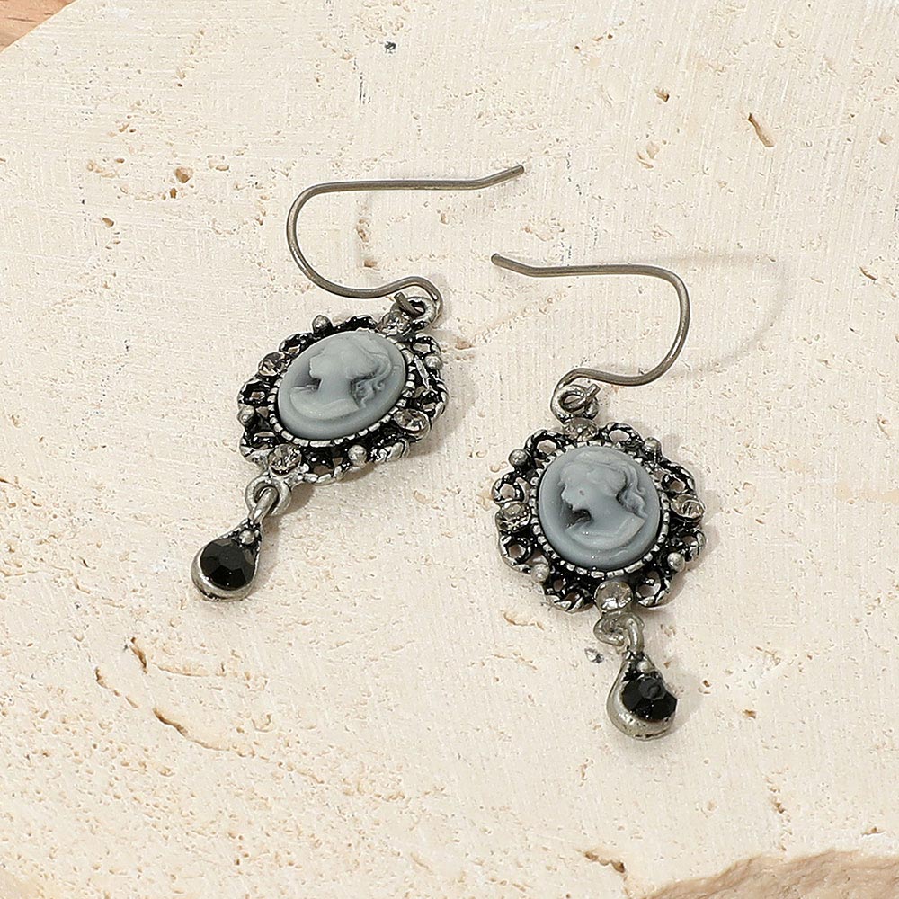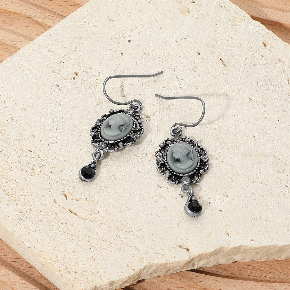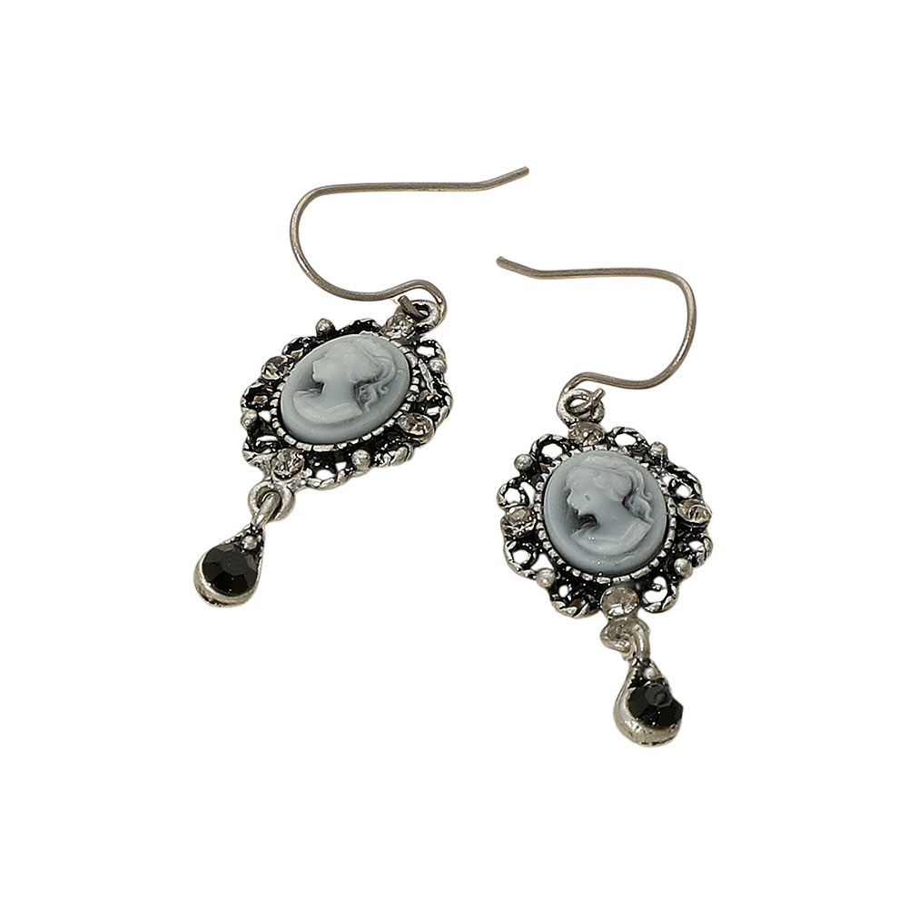 Details • Size : 0.6" X 1.6" • Fish Hook Back • Elegant vintage cameo drop earrings featuring detailed profile portraits framed with sparkling rhinestones and teardrop crystal charms. Perfect for adding a touch of timeless sophistication to both casual and formal outfits. • Made in USA • Lead and Nickel Compliant