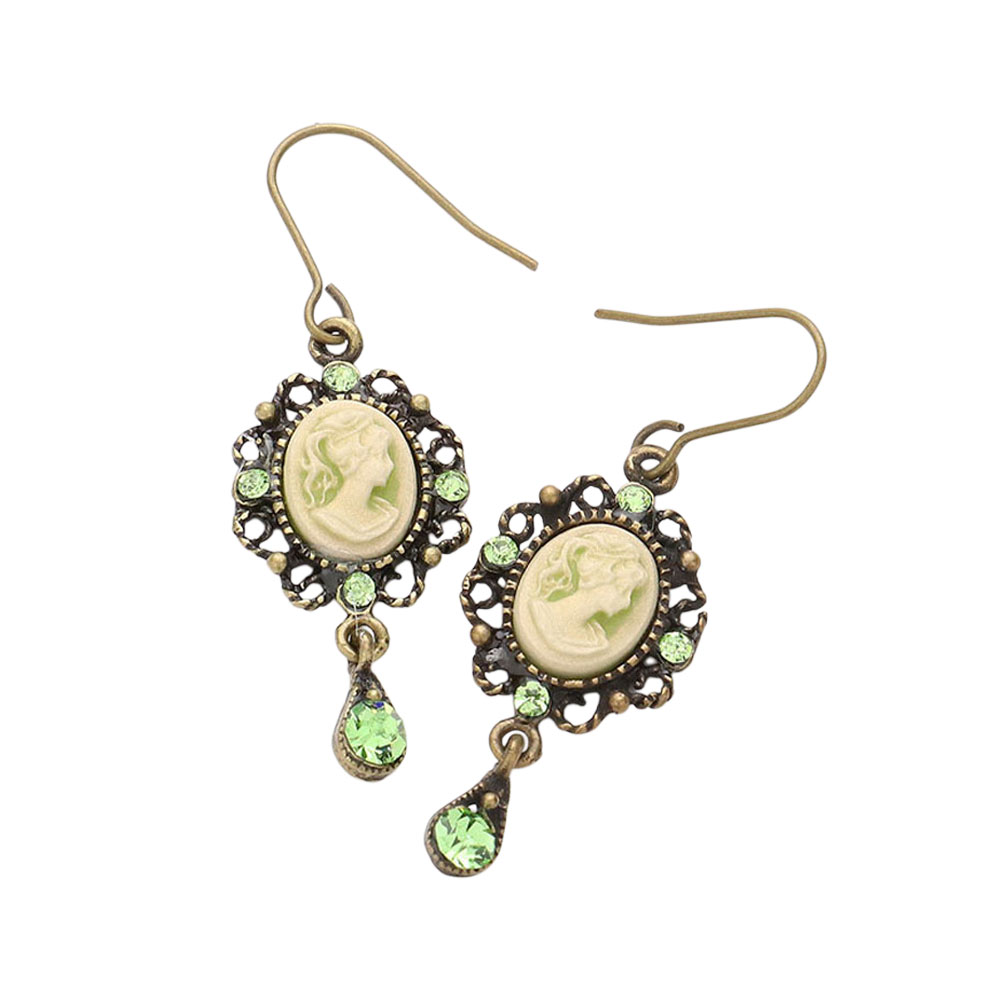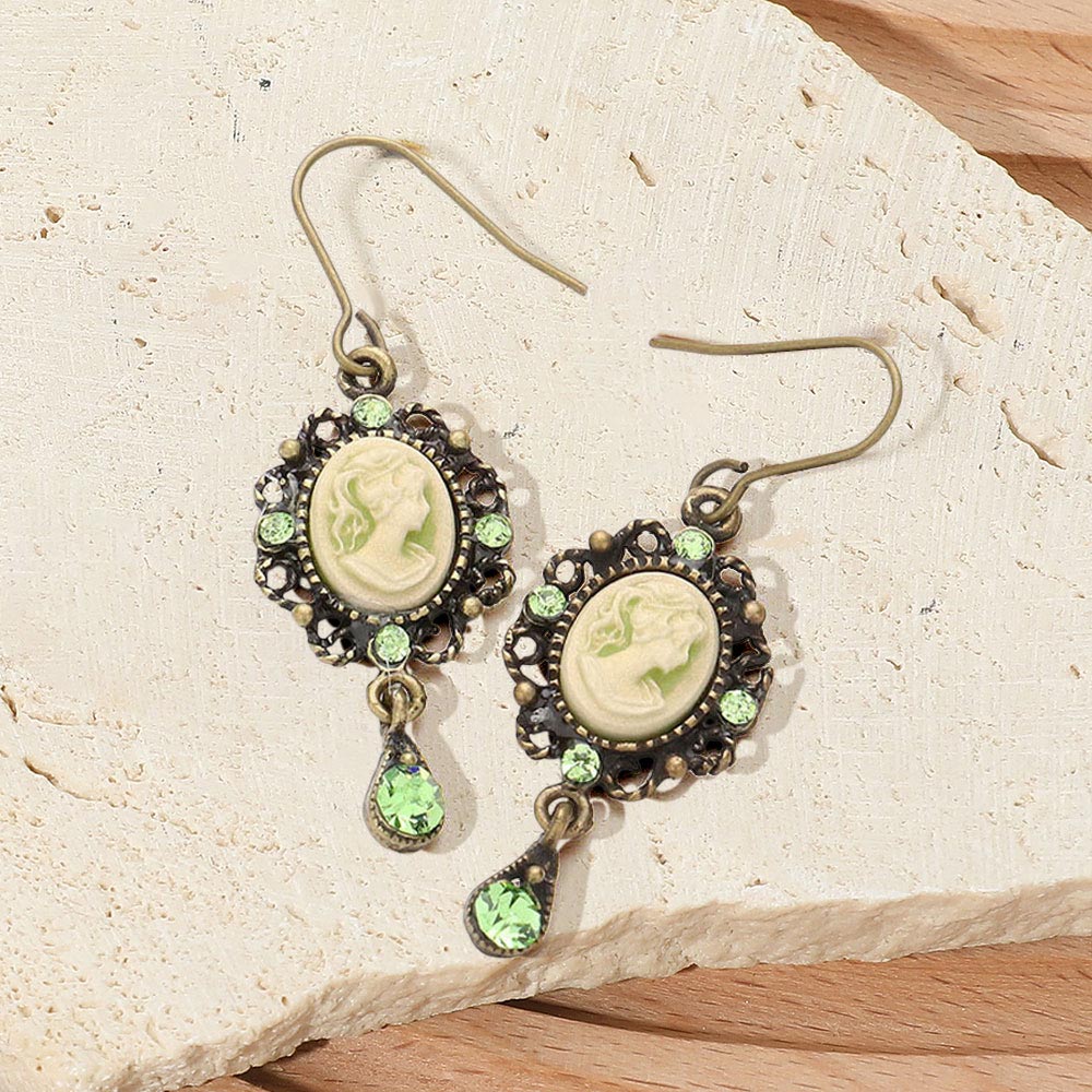 • Elegant vintage cameo drop earrings featuring detailed profile portraits framed with sparkling rhinestones and teardrop crystal charms. Perfect for adding a touch of timeless sophistication to both casual and formal outfits.