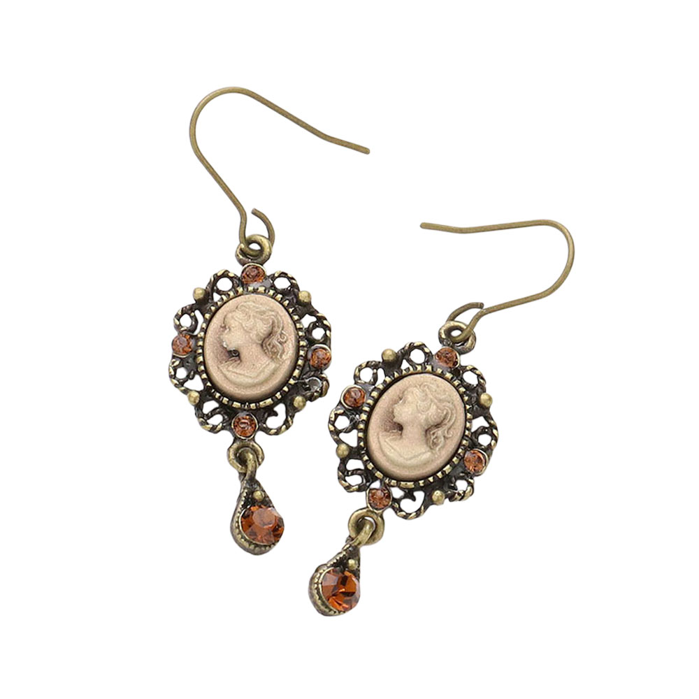 Details • Size : 0.6" X 1.6" • Fish Hook Back • Elegant vintage cameo drop earrings featuring detailed profile portraits framed with sparkling rhinestones and teardrop crystal charms. Perfect for adding a touch of timeless sophistication to both casual and formal outfits. • Made in USA • Lead and Nickel Compliant
