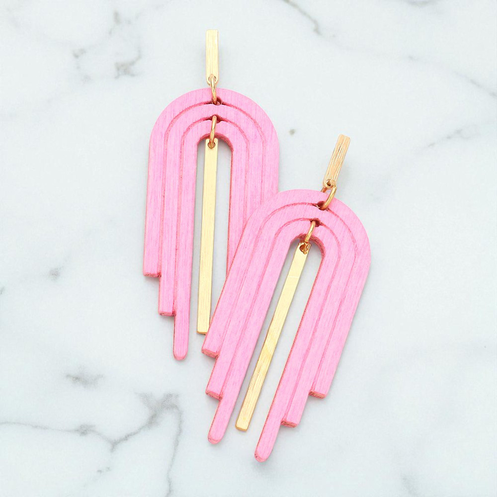 Details • Size : 0.8" X 2.25" • Post Back • Trendy geometric dangle earrings featuring layered arch shapes paired with sleek metallic accents. Lightweight and stylish, these earrings bring a modern pop to casual wear or add a fun twist to evening looks. • Lead and Nickel Compliant