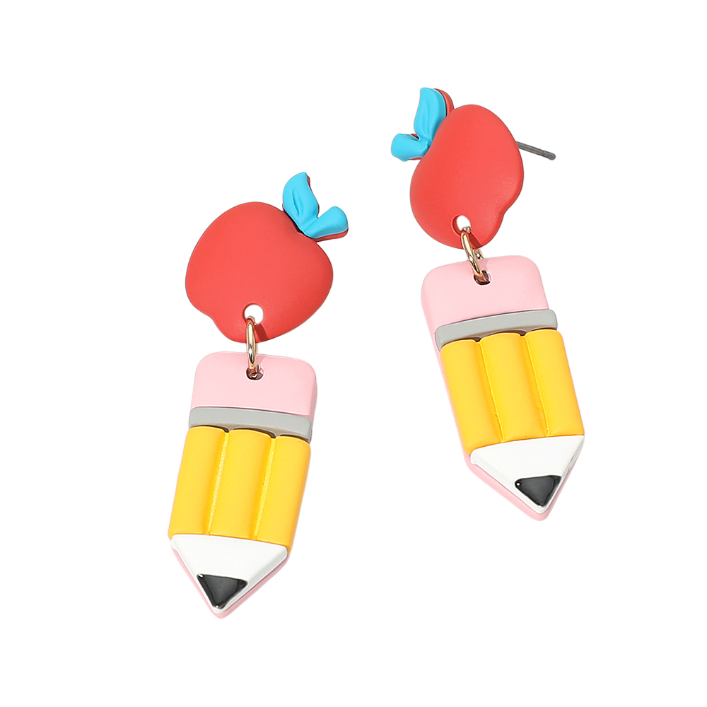 Details • Size : 0.7" X 2.1" • Post Back • Charming pencil and apple drop earrings featuring a fun school-inspired design with layered detailing and lightweight construction. A playful accessory perfect for teachers, students, or anyone who loves creative, themed jewelry that adds personality to any outfit. • Lead and Nickel Compliant