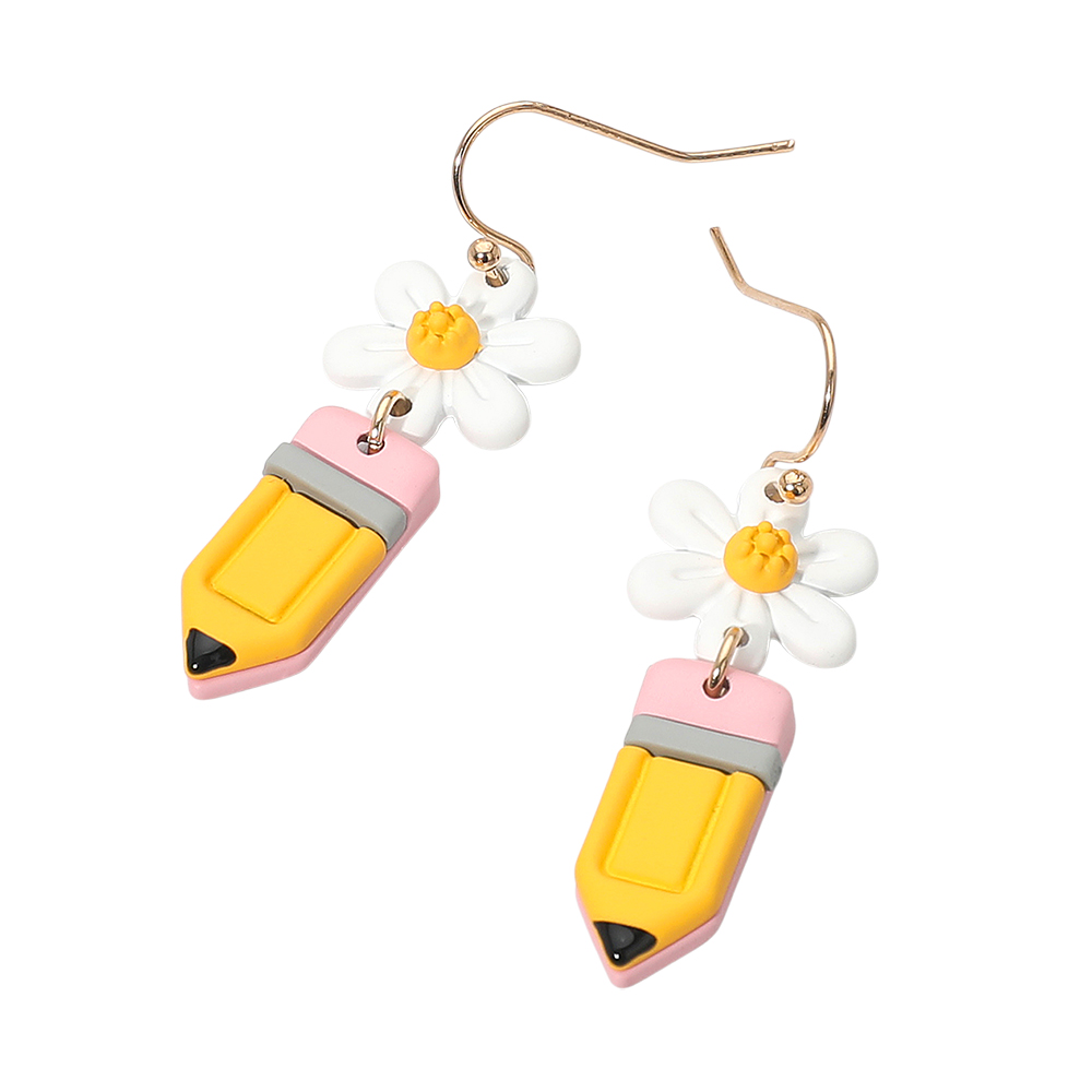 Details • Size : 0.6" X 1.8" • Fish Hook Back • Adorable pencil and daisy drop earrings featuring a fun school-themed design with layered details and playful charm accents. Lightweight, eye-catching, and perfect for teachers, students, or anyone who loves creative accessory styles. Ideal for gifting. • Lead and Nickel Compliant