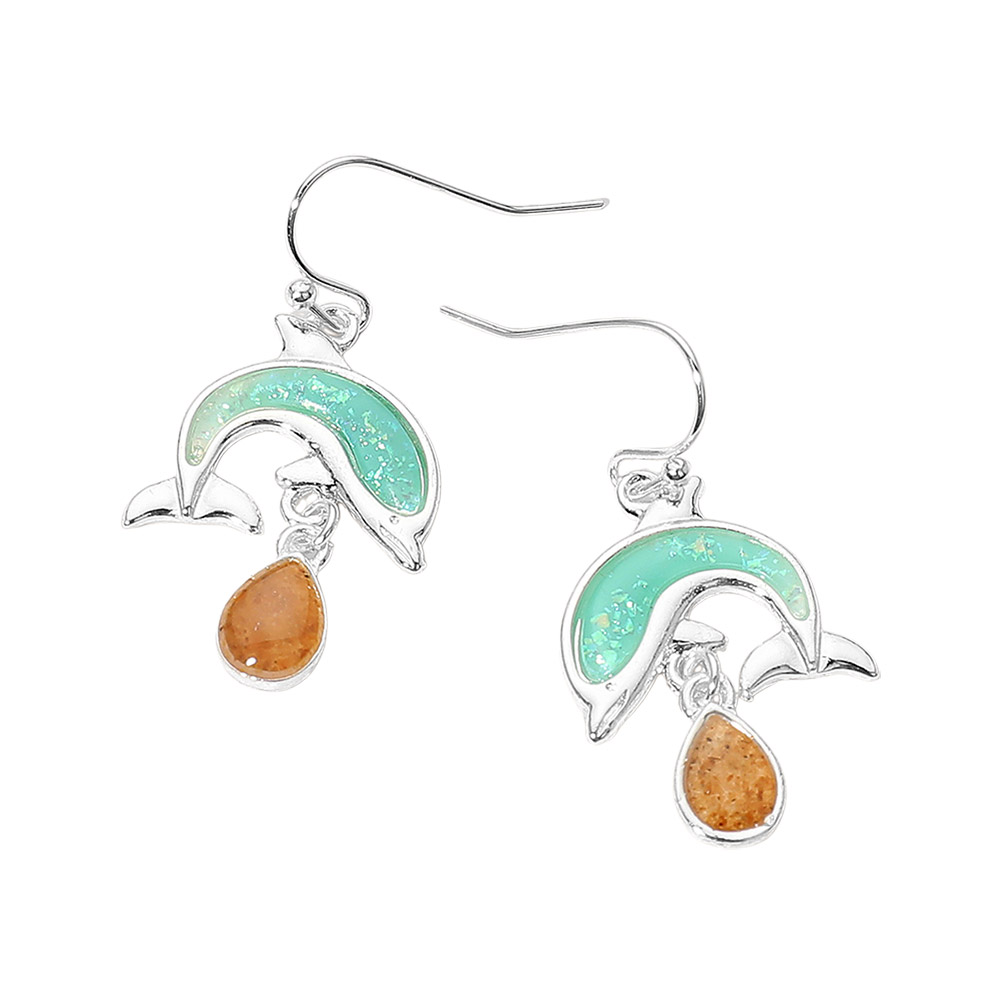 • Playful dolphin charm drop earrings featuring a graceful marine silhouette with subtle movement for eye catching appeal. A fun coastal inspired accessory ideal for summer outfits, vacation looks, and beach themed collections, adding personality and seasonal charm to boutique and gift focused assortments.