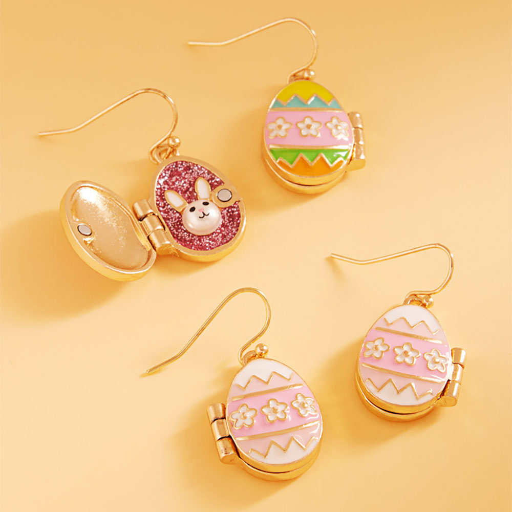• Easter egg locket drop earrings featuring a playful hinged design with charming seasonal details. This whimsical style opens to reveal a fun surprise, making it a standout accessory for spring collections. Ideal for boutiques, gift shops, and holiday-themed assortments looking to add novelty earrings with eye-catching movement, cheerful character appeal, and strong gifting potential.