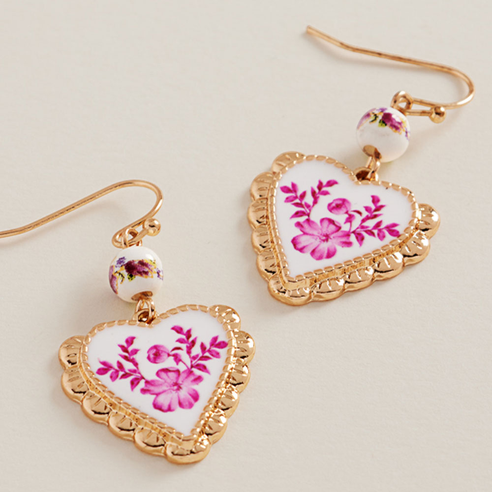 Enamel Floral Heart Frame Charm Drop Dangle Earrings