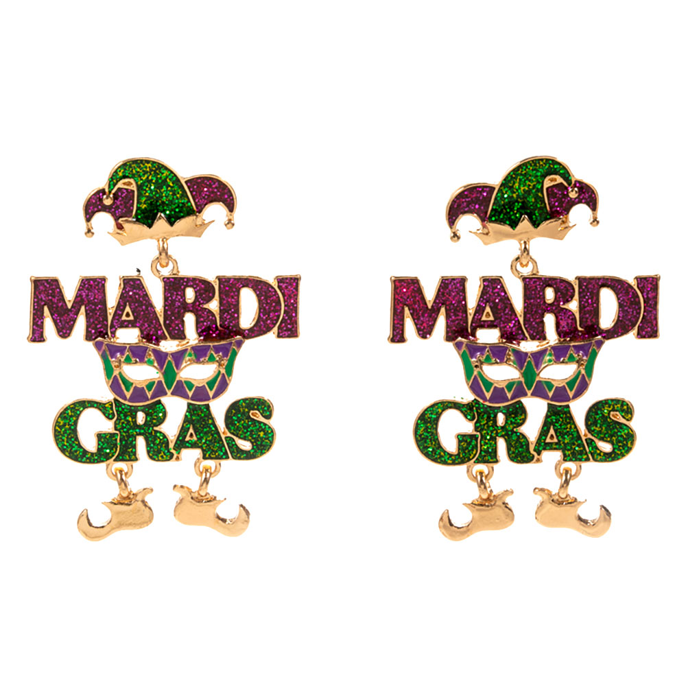 • Celebrate in true carnival style with these Mardi Gras Letter Drop Earrings. Featuring bold lettering, festive mask details, and sparkling accents, they’re the perfect statement accessory for parades, parties, or themed celebrations full of joy and flair.