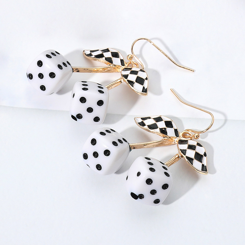 Enamel Retro Checkered Leaf Cherry Dice Dangle Earrings