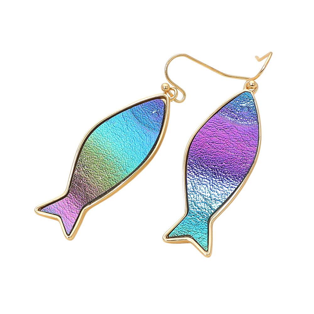 Details • Size : 0.6" X 2" • Fish Hook Back • Playful fish shape drop earrings with a shimmering iridescent finish framed in gold tone, adding a fun and stylish touch to casual and festive looks. Perfect for gifting or making a bold fashion statement. • Lead and Nickel Compliant