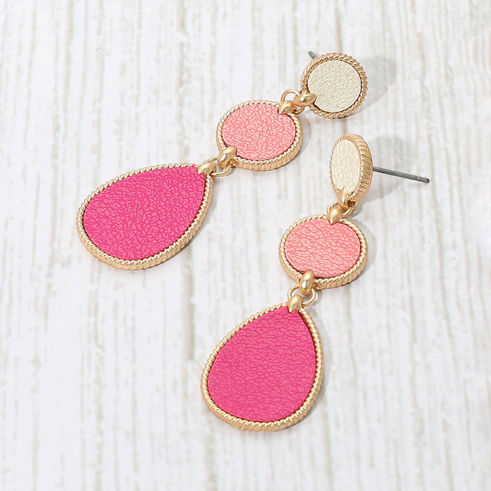 Details • Size : 0.75" X 2.2" • Post Back • Trendy teardrop dangle earrings with dual faux leather drops in bold and neutral tones. Lightweight and versatile, perfect for casual outfits, parties, or making a stylish everyday statement. • Lead and Nickel Compliant