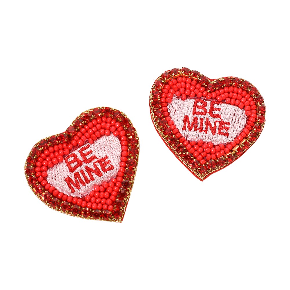 Felt Back BE MINE Message Embroidered Seed Bead Stone Embellished Earrings