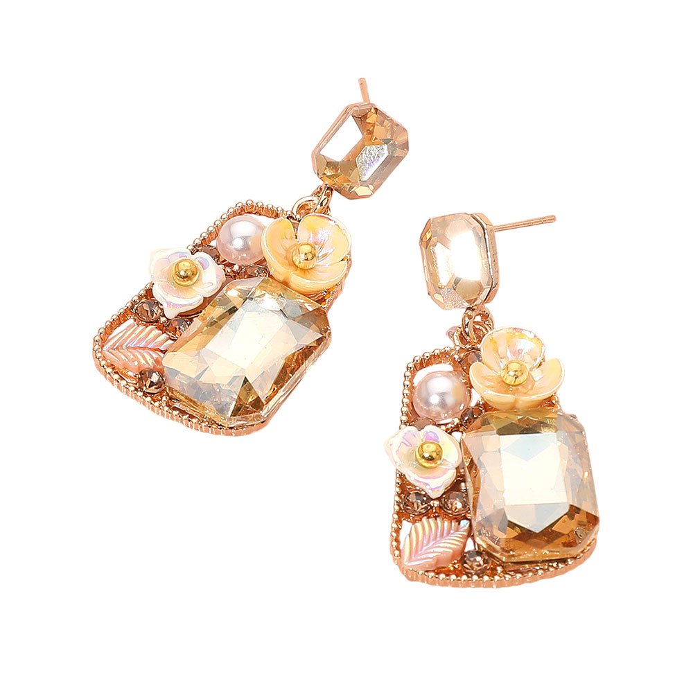 Floral Stone Pearl Leaf Accent Frame Dangle Earrings