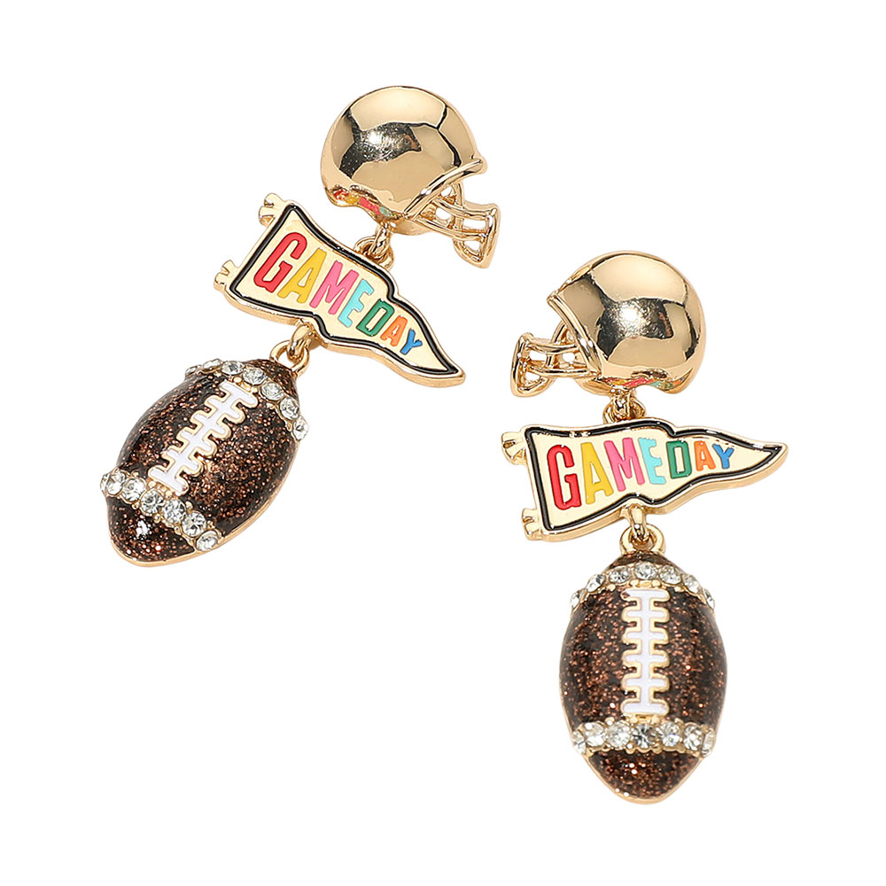 Details • Size : 0.9" X 2" • Post Back • Show your team spirit with these fun Game Day football helmet earrings. Featuring colorful lettering, sparkling accents, and playful sports-inspired charms, they’re the perfect accessory to celebrate every kickoff, tailgate, or victory with bold, game-ready style. • Lead and Nickel Compliant