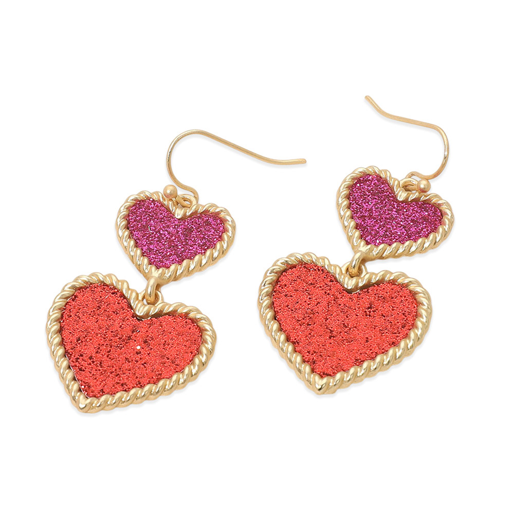 Glitter Double Heart Link Drop Dangle Earrings