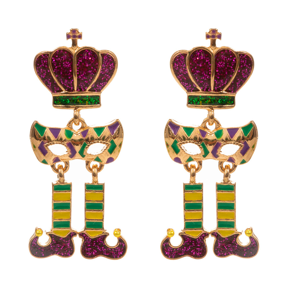 Details • Size : 0.8" X 2" • Titanium Post Back • Add carnival charm with these Mardi Gras Crown Mask Drop Earrings. Featuring glittering crown, mask, and boot details, they capture the joyful spirit of the season and make a bold accessory for parades, parties, or themed celebrations. • Hypoallergenic • Lead and Nickel Compliant