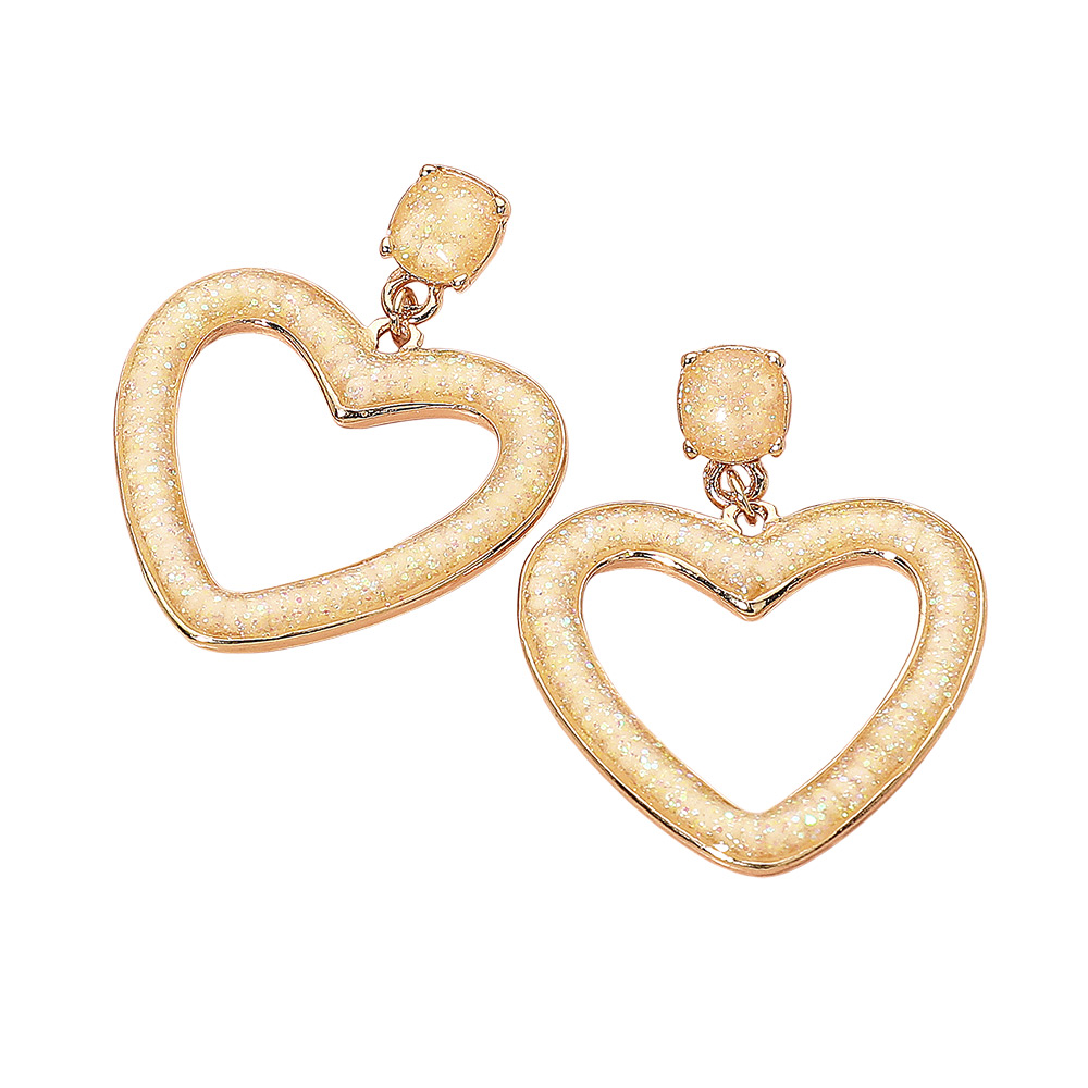 Details • Size : 1.25" X 1.7" • Post Back • Lightweight open-heart dangle earrings featuring a glittery accent finish and a bold drop-heart design. A stylish statement accessory ideal for gifting or adding a touch of sparkle to everyday and special-occasion looks. • Lead and Nickel Compliant
