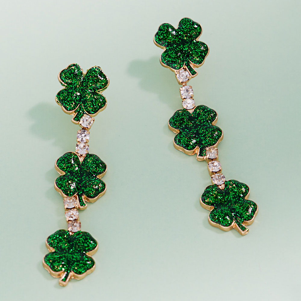 • Festive drop earrings featuring a trio of shamrock charms linked with sparkling accents for eye-catching movement. Designed for seasonal celebrations, parades, themed outfits, or gift giving, adding playful style to day or evening looks with a lightweight feel.