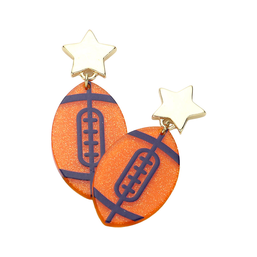 Details • Size : 0.8" X 1.9" • Post Back • Cheer in style with these gameday football earrings featuring star stud tops and bold football-shaped drops. A fun and spirited accessory perfect for tailgates, sports parties, and game day outfits, adding playful energy and team spirit to every celebration. • Lead and Nickel Compliant