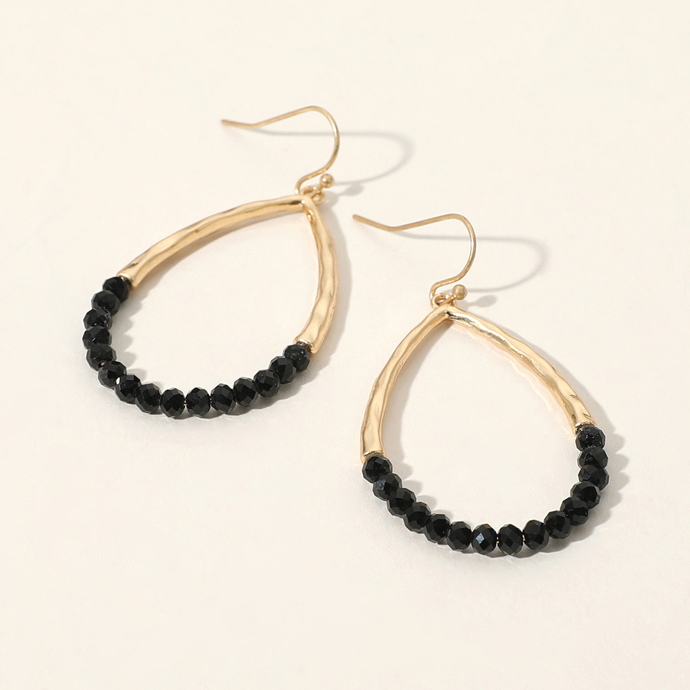 Details • Size : 1.1" X 2" • Fish Hook Back • Modern teardrop earrings featuring a sleek, curved frame accented with a row of faceted beads. These earrings offer a bold yet elegant touch, perfect for enhancing both everyday outfits and formal ensembles. A versatile accessory for timeless, polished style. • Lead and Nickel Compliant