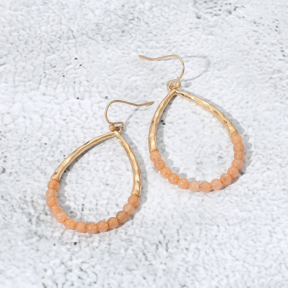 Hammered Metal Stone Beaded Open Teardrop Dangle Earrings