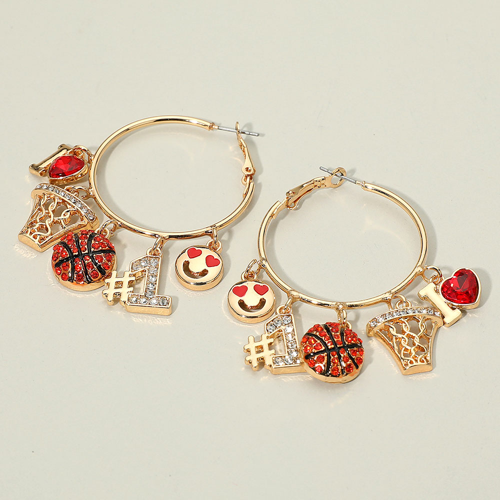 Details • Size : 2.2" X 2.4" • Omega Back • Basketball hoop earrings decorated with playful sports charms including basketball, hoop, #1, heart, and emoji designs. Lightweight and eye-catching, perfect for gameday outfits, fan gifts, or sporty statement style. • Lead and Nickel Compliant