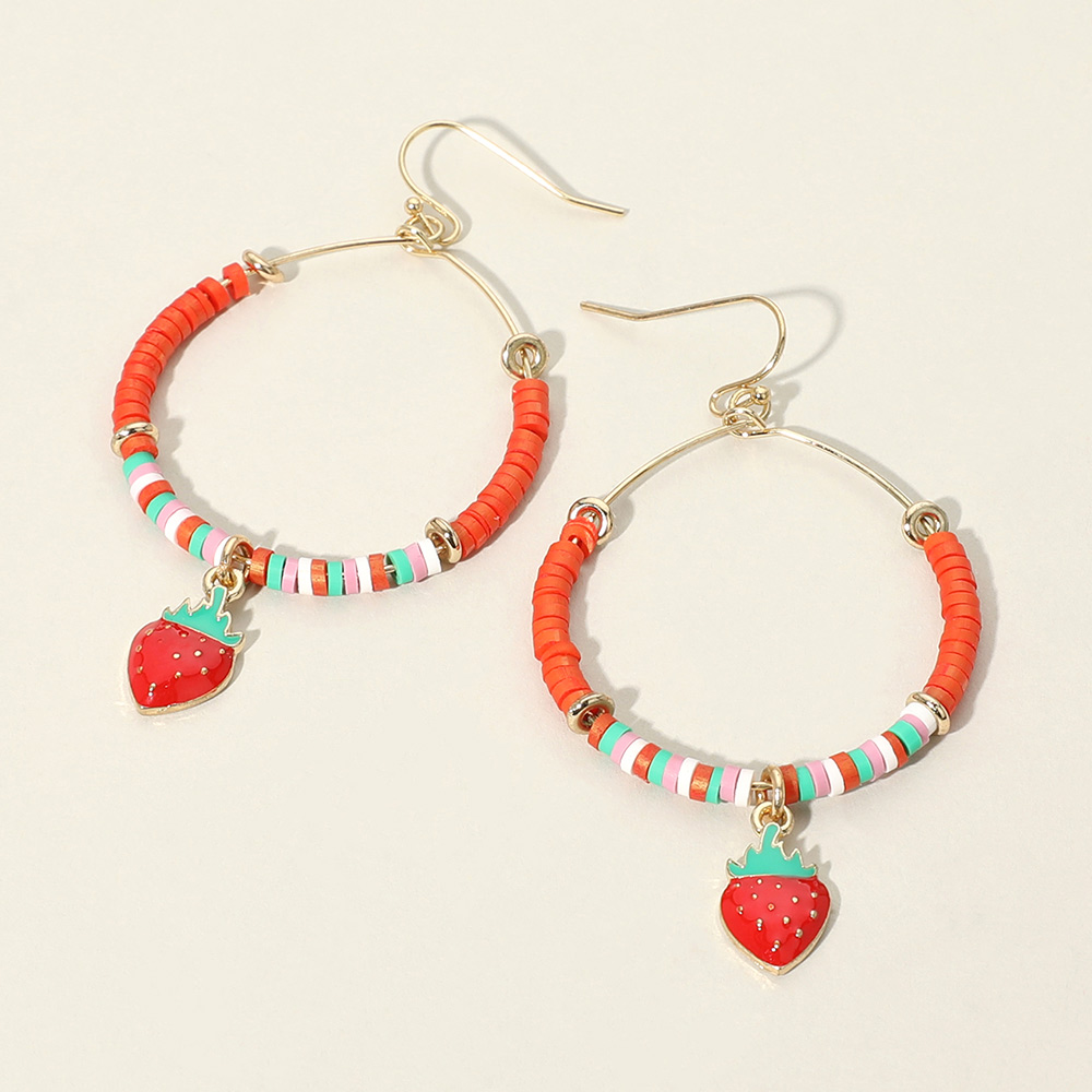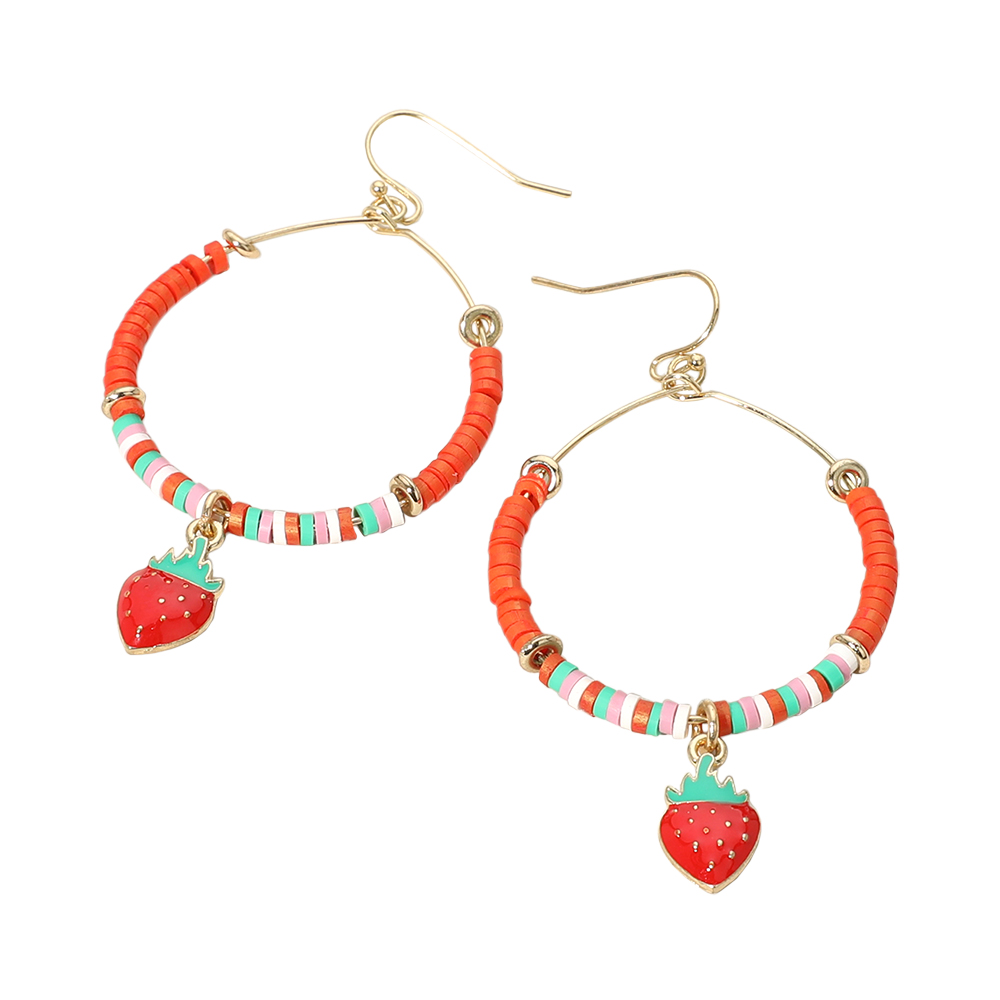 Heishi Beaded Wire Ring Enamel Strawberry Pointed Dangle Earrings