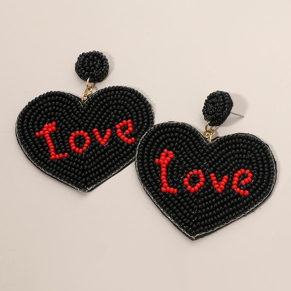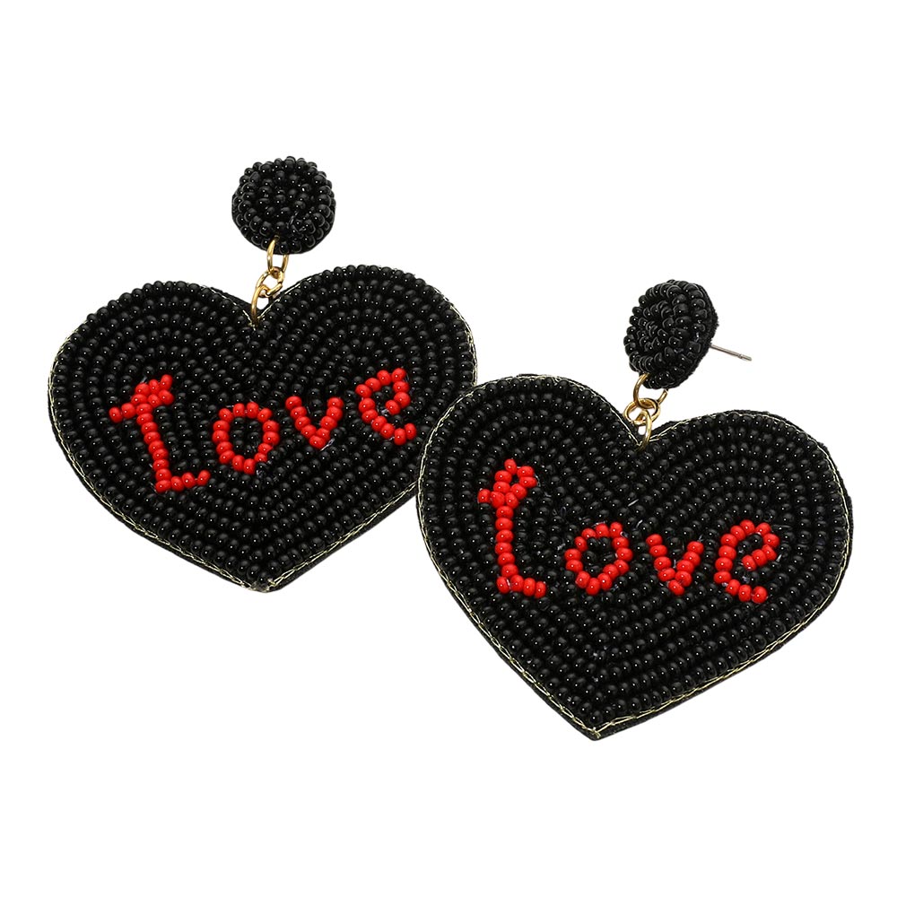 Love Message Felt Back Seed Beaded Heart Dangle Earrings Love Message Felt Back Seed Beaded Heart Dangle Earrings