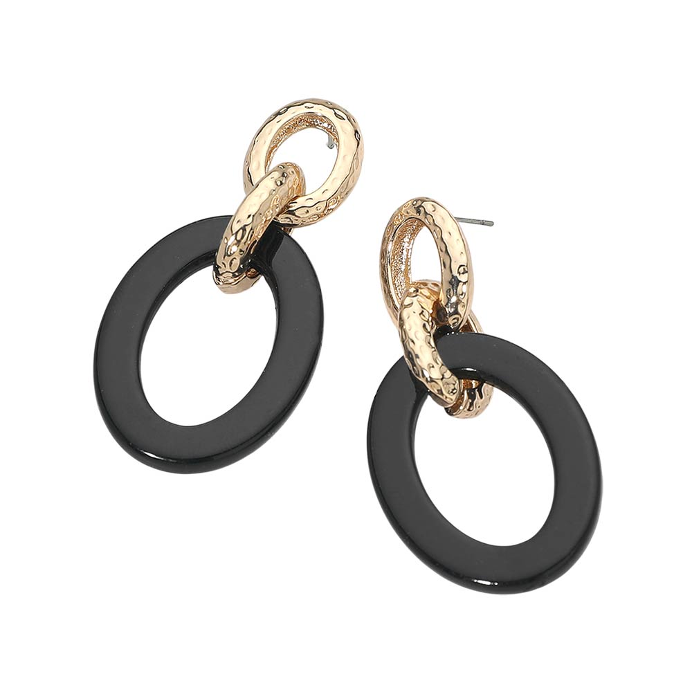 Details • Size : 1.2" X 2.25" • Post Back • Modern linked drop earrings featuring a smooth oval design paired with a textured ring accent for added depth and movement. The layered silhouette creates an elegant balance of structure and flow, making these earrings easy to style from day to night. A versatile statement accessory that elevates everyday outfits, workwear, and special occasion looks with effortless sophistication. • Lead and Nickel Compliant