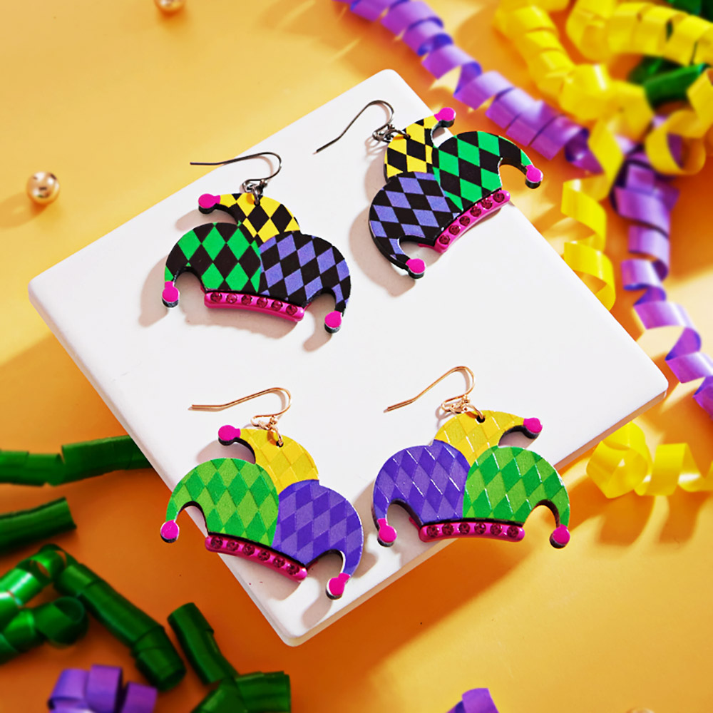 Details • Size : 1.5" X 1.7" • Fish Hook Back • Add festive cheer with these Mardi Gras jester hat earrings, designed in vibrant carnival hues for a playful statement look. Lightweight and eye-catching, they capture the joyful spirit of celebration and make a perfect finishing touch for any Mardi Gras outfit. • Lead and Nickel Compliant