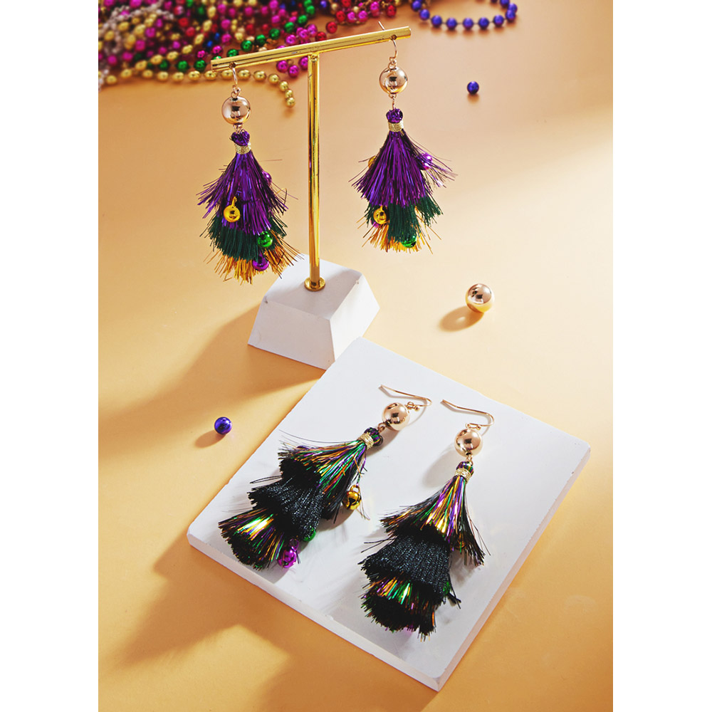 • Add festive flair with these Mardi Gras layered tassel drop earrings. Designed with shimmering multitone threads and playful movement, they bring instant energy to any celebration look. Perfect for parties and parades, these earrings exude bold charm and vibrant carnival spirit.