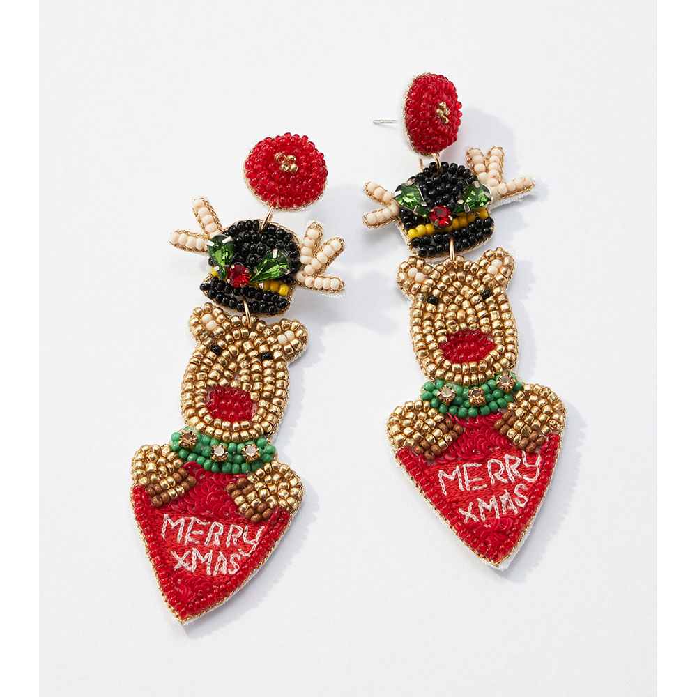 Details • Size : 1.25" X 3.5" • Post Back • Add holiday cheer with these festive reindeer earrings featuring intricate beading and "Merry Xmas" message. A fun seasonal accessory perfect for parties, events, or gifting. Whimsical and full of spirit. • Lead and Nickel Compliant • Made In India