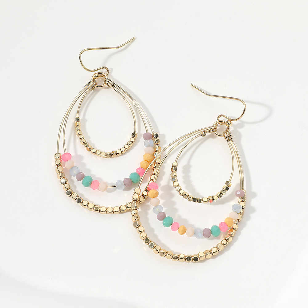 • Elegant teardrop earrings featuring layered wire loops and delicate beaded accents. A lightweight accessory perfect for casual or dressy occasions.