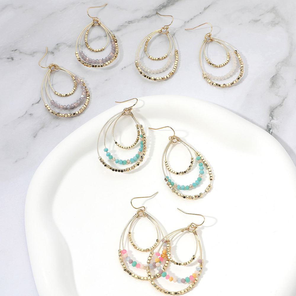 • Elegant teardrop earrings featuring layered wire loops and delicate beaded accents. A lightweight accessory perfect for casual or dressy occasions.