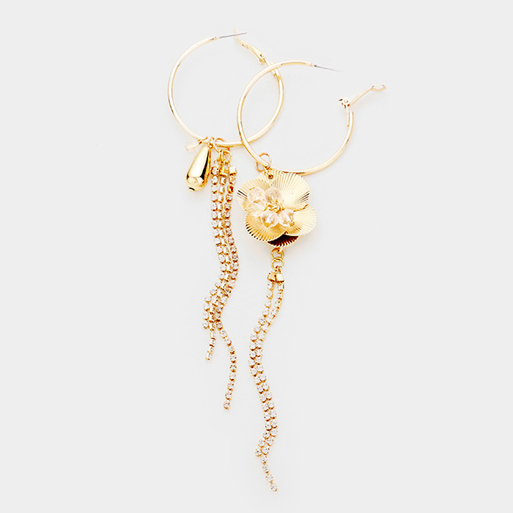 Metal Flower Rhinestone Pave Tassel Hoop Earrings