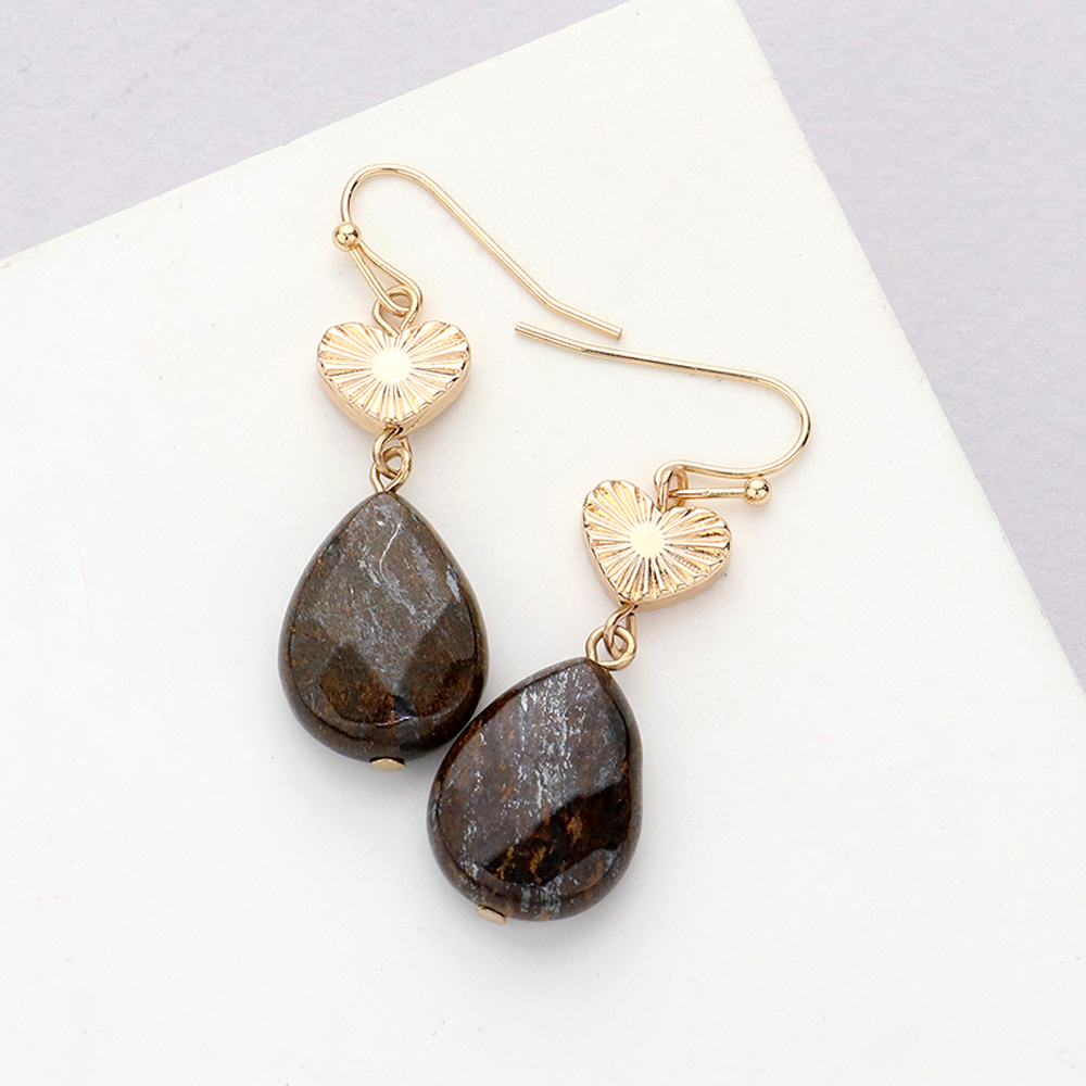 Metal Heart Teardrop Natural Stone Link Dangle Earrings